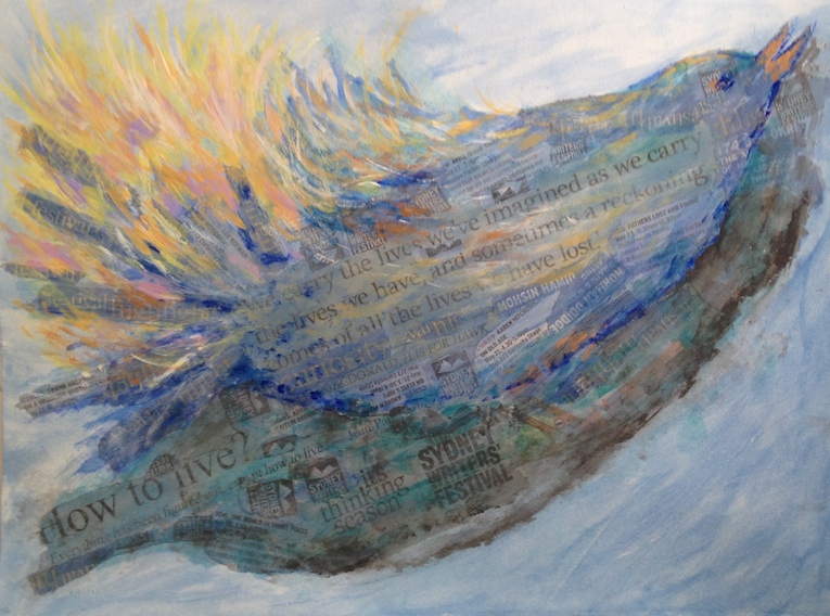 I make a collage of program fragments to process my rich experiences of Sydney Writers’ Festival. I don’t like the picture that emerges. It is not the multicoloured vision in my head. It looks like a Squidbird.