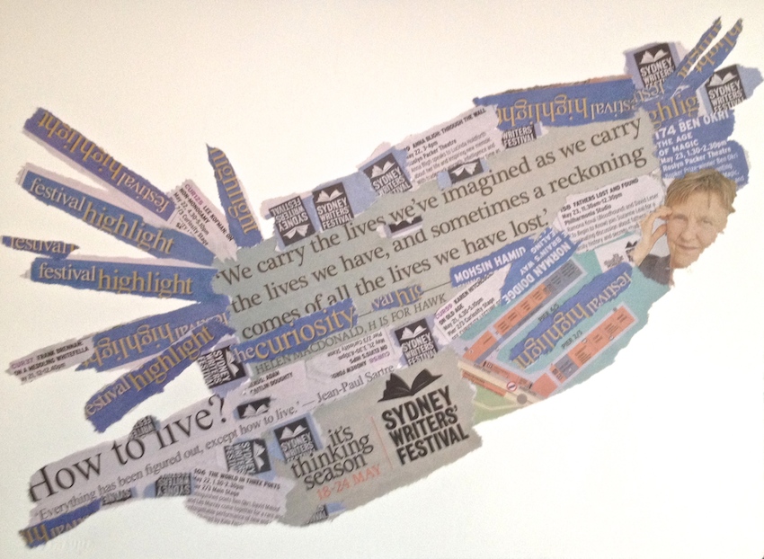 I made a collage to process my rich experiences of Sydney Writers’ Festival. I used only fragments of the program. I didn’t like the picture that emerged. It looked like a Squidbird. It was not like the multicoloured vision in my head.