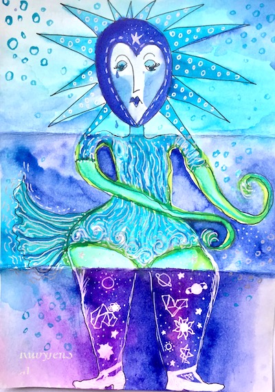 Don’t you love how people come up with different ideas and approaches? Quirky ones? I never would have thought of a jacket made of flowers with eyes. I didn’t think of doing white galaxies on purple legs. Wow.
